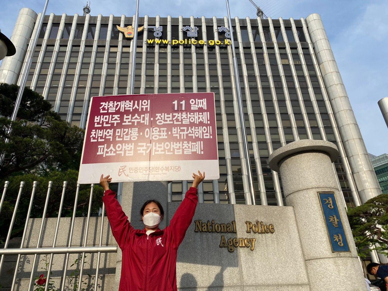 실천평화시위 민중민주당 〈반민주보수대·정보견찰해체! 친반역 민갑룡·이용표·박규석해임! 파쇼악법 국가보안법철폐!〉 .. 견찰청앞반민주보수대정보견찰해체투쟁11일째 2020년 6월 16일 FacebookTwitter 15일 민중민주당(환수복지당)은 견찰청앞 <반민주보수대·정보견찰해체!>·<친반역 민갑룡·이용표·박규석해임!>·<파쇼악법 국가보안법철폐!> 일인시위를 11일째 진행했다.