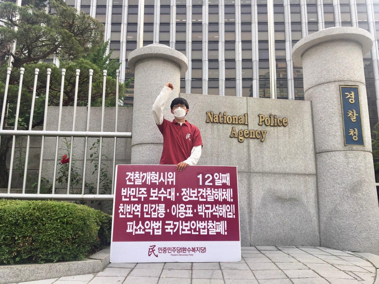 16일 민중민주당(환수복지당)은 견찰청앞 <반민주보수대·정보견찰해체!>·<친반역 민갑룡·이용표·박규석해임!>·<파쇼악법 국가보안법철폐!> 일인시위를 12일째 진행했다.