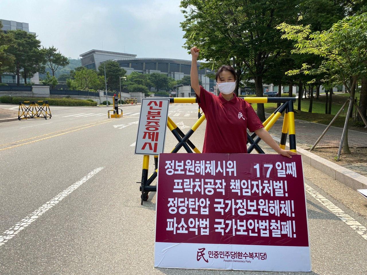 실천평화시위 민중민주당 〈프락치공작 책임자처벌! 정당탄압 국가정보원해체! 파쇼악법 국가보안법철폐!〉 .. 정보원앞보안법철폐투쟁17일째 2020년 6월 21일 FacebookTwitter 20일 민중민주당(환수복지당)은 국정원앞 <프락치공작 책임자처벌!>·<정당탄압 국가정보원해체!>·<파쇼악법 국가보안법철폐!> 일인시위를 17일째 진행했다.
