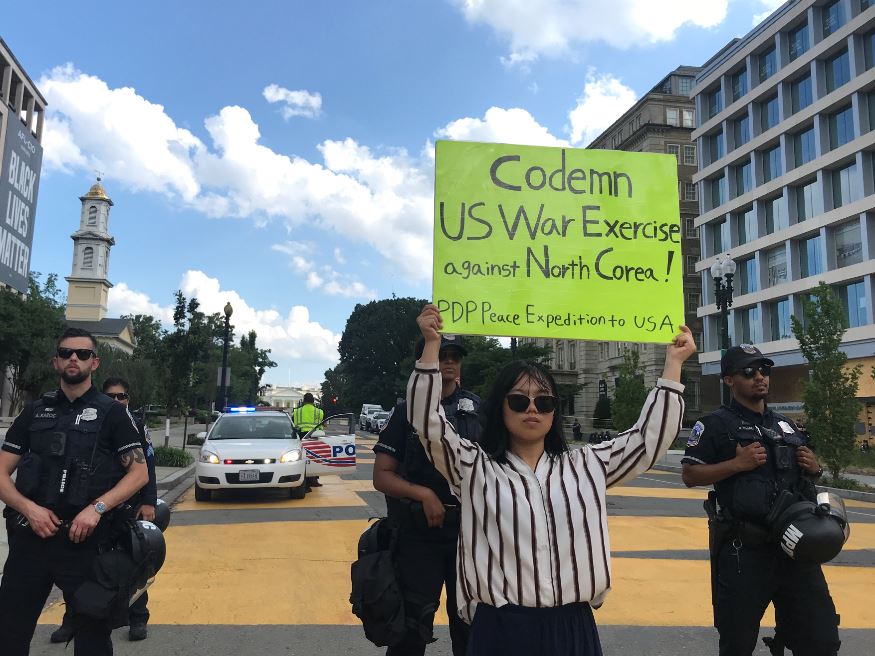 민중민주당(환수복지당) 미국평화원정단은 23일(현지시간) 워싱턴D.C백악관앞에서 <전쟁화근 만악근원 미군즉각철거!>, <미군유지비증액 트럼프정부규탄!>, <북침전쟁연습 트럼프정부규탄!>, <미제국주의 아래에서 우리는 숨쉴수없다>, <미제국주의는 전세계 민중의 생명위협을 그만두라> 등을 촉구하는 평화시위를 총1143일째 진행했다.