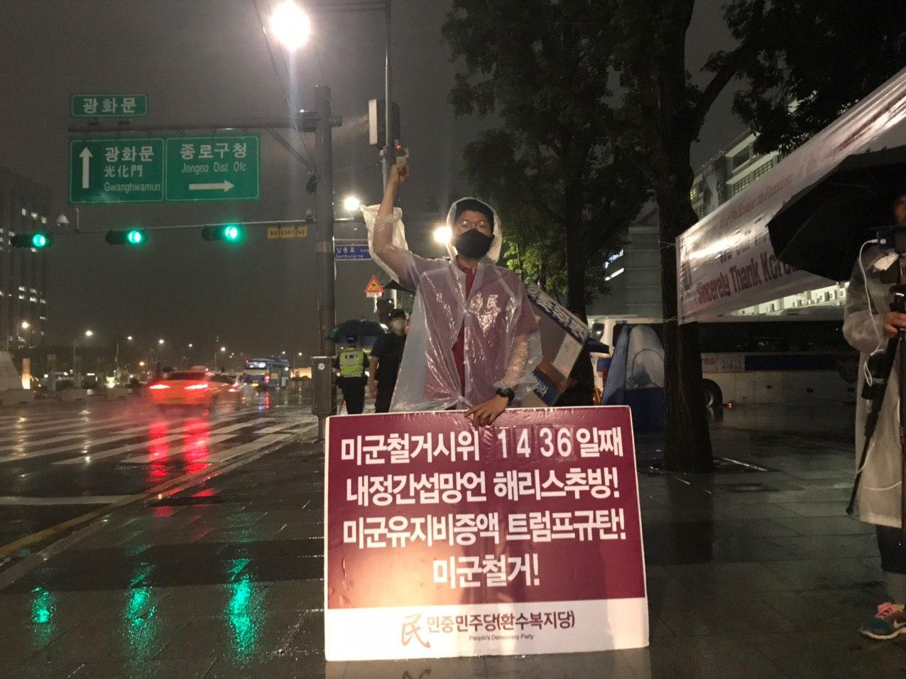 민중민주당(환수복지당)은 24일 미대사관앞에서 <내정간섭망언 해리스추방! 미군유지비증액! 트럼프규탄! 미군철거!>촉구 평화시위를 1436일째 진행했다.