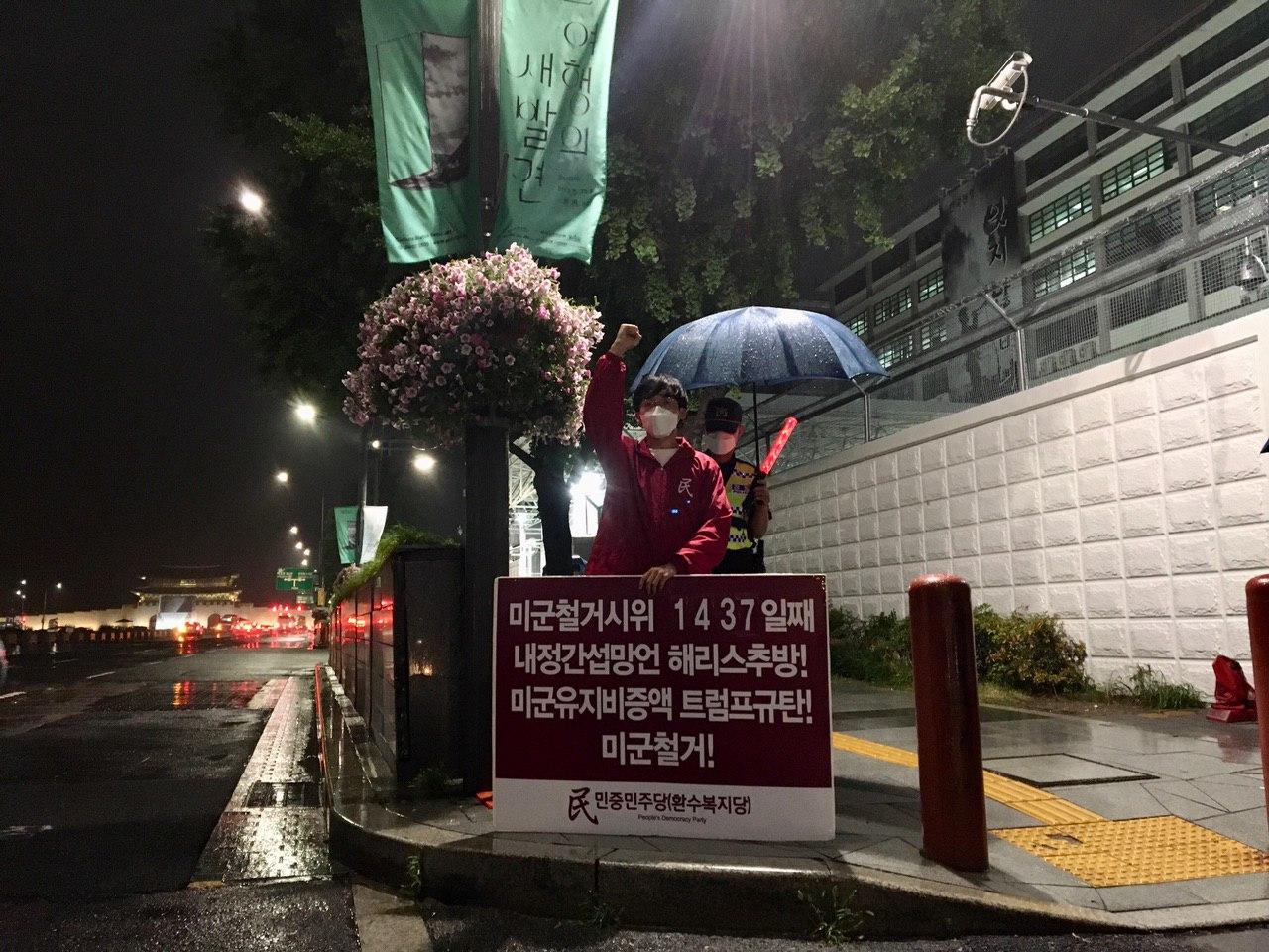 민중민주당(환수복지당)은 25일 미대사관앞에서 <내정간섭망언 해리스추방! 미군유지비증액! 트럼프규탄! 미군철거!>촉구 평화시위를 1437일째 진행했다.