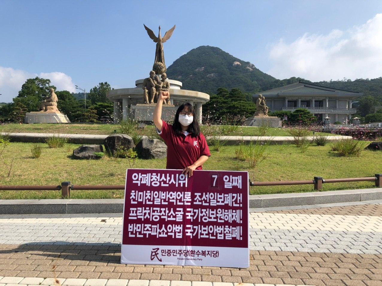 당원들은 청와대앞 <친미친일반역언론 조선일보폐간!>·<프락치공작소굴 국가정보원해체!>·<반민주파쇼악법 국가보안법철폐!>투쟁을 7일째 진행했다.