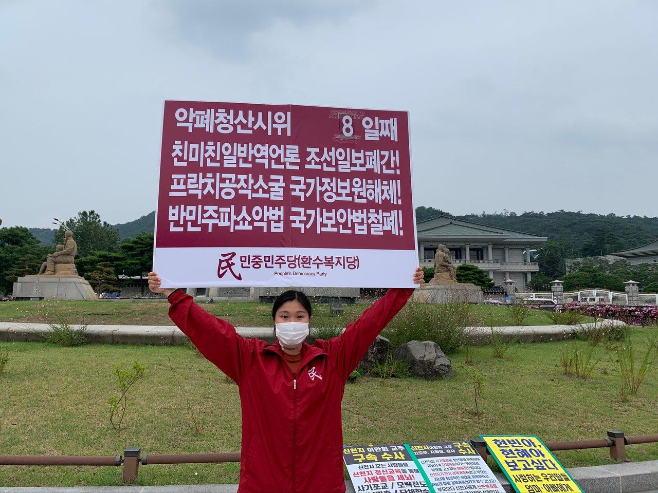 당원들은 청와대앞 <친미친일반역언론 조선일보폐간!>·<프락치공작소굴 국가정보원해체!>·<반민주파쇼악법 국가보안법철폐!>투쟁을 8일째 진행했다.