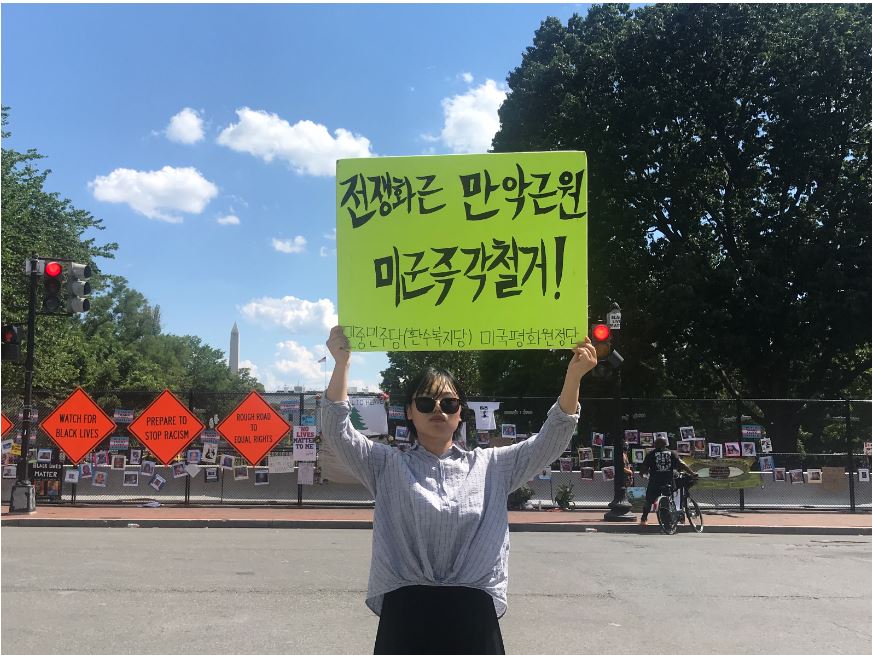 민중민주당(환수복지당) 미국평화원정단은 30일(현지시간) 워싱턴D.C백악관앞에서 <전쟁화근 만악근원 미군즉각철거!>, <미군유지비증액 트럼프정부규탄!>, <북침전쟁연습 트럼프정부규탄!> 등을 촉구하는 평화시위를 총1150일째 진행했다.