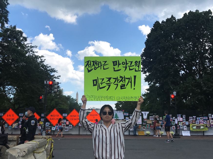 민중민주당(환수복지당) 미국평화원정단은 1일(현지시간) 워싱턴D.C백악관앞에서 <전쟁화근 만악근원 미군즉각철거!>, <미군유지비증액 트럼프정부규탄!>, <북침전쟁연습 트럼프정부규탄!> 등을 촉구하는 평화시위를 총1151일째 진행했다.