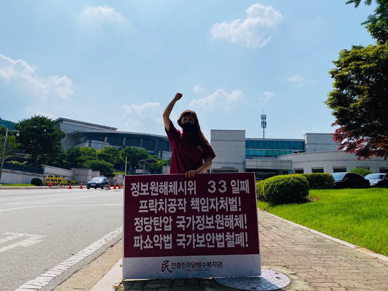 이날 민중민주당은 정보원앞 <프락치공작 책임자처벌!>·<정당탄압 국가정보원해체!>·<파쇼악법 국가보안법철폐!> 일인시위를 33일째 전개했다.