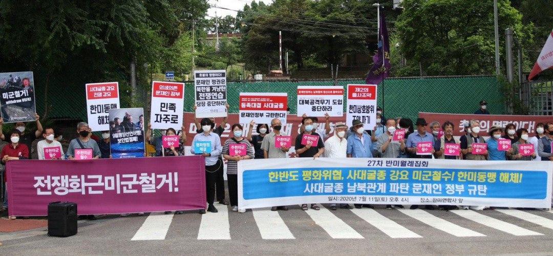 7월11일 한미연합사앞에서 <한반도평화위협 사대굴종강요 미군철거! 미남동맹해체! 사대굴종남북관계파탄 문재인정부규탄!> 27차반미월례집회가 열렸다.