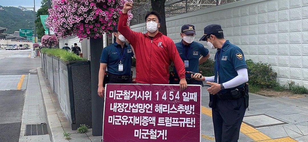 민중민주당(환수복지당)은 12일 미대사관앞에서 <내정간섭망언 해리스추방! 미군유지비증액! 트럼프규탄! 미군철거!>촉구 평화시위를 1454일째 진행했다.