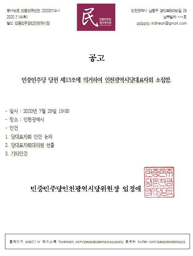 [공고] 민중민주당 인천시당 당대표자회 소집
