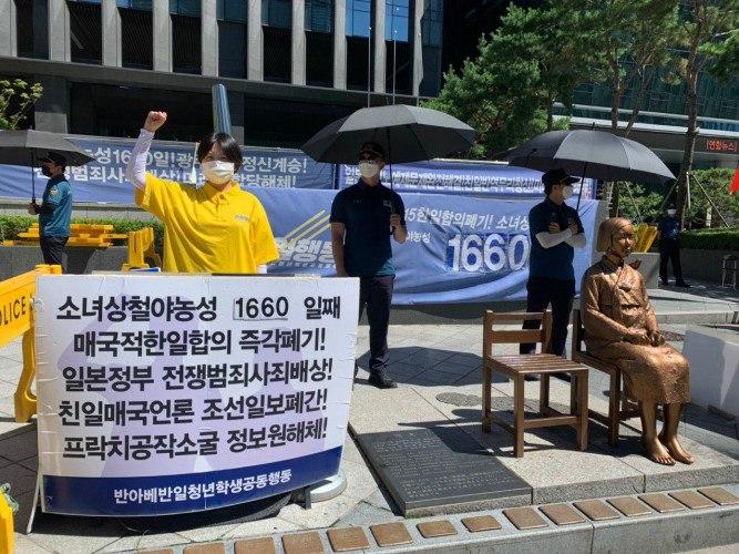 15일 반일행동(반아베반일청년학생공동행동)은 <매국적한일합의폐기! 전쟁범죄사죄배상!>촉구 소녀상농성을 1660일째 진행했다.