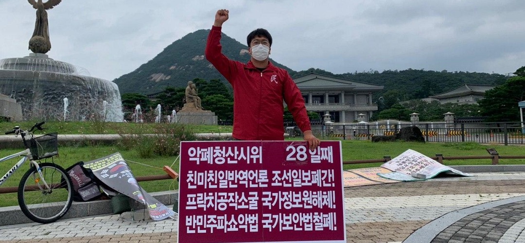 당원들은 청와대앞 <친미친일반역언론 조선일보폐간!>·<프락치공작소굴 국가정보원해체!>·<반민주파쇼악법 국가보안법철폐!>투쟁을 28일째 진행했다.