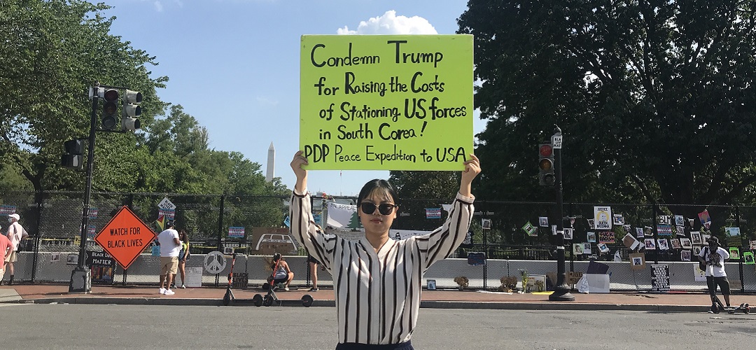 민중민주당(환수복지당) 미국평화원정단은 19일(현지시간) 워싱턴D.C백악관앞에서 <전쟁화근 만악근원 미군즉각철거!>, <미군유지비증액 트럼프정부규탄!>, <북침전쟁연습 트럼프정부규탄!> 등을 촉구하는 평화시위를 총1169일째 진행했다.