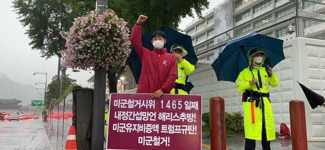 민중민주당(환수복지당)은 23일 미대사관앞에서 <내정간섭망언 해리스추방! 미군유지비증액! 트럼프규탄! 미군철거!>촉구 평화시위를 1465일째 진행했다.