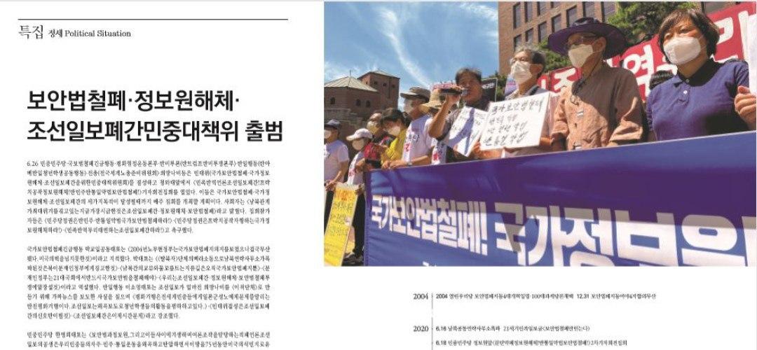 국가보안법철폐긴급행동 박교일공동대표는 <2004년노무현정부는국가보안법폐지의지를보였으나결국무산됐다.미국의벽을넘지못한것>이라고 지적했다. 박대표는 <<탈북자>단체의삐라소동으로남북연락사무소가폭파된것은북이문재인정부에게경고한것>·<남북간의교류와물꼬를트는지름길은오직국가보안법폐지뿐>·<문재인정부는21대국회에서반드시국가보안법을철폐해야>·<우리는조선일보폐간·정보원해체·보안법철폐투쟁에앞장설것>이라고 역설했다. 반일행동이소영대표는 조선일보가 얼마전 희망나비를 <이적단체>로 만들기 위해 가짜뉴스를 보도한 사실을 짚으며 <평화기행은전세계민중들에게일본군성노예제문제를알리는반전평화기행이다.조선일보는왜곡보도로청년학생들의활동을폄하하고있다.>·<민대위결성은조선일보폐간의신호탄이될것>·<조선일보폐간은이제시간문제>라고 강조했다.