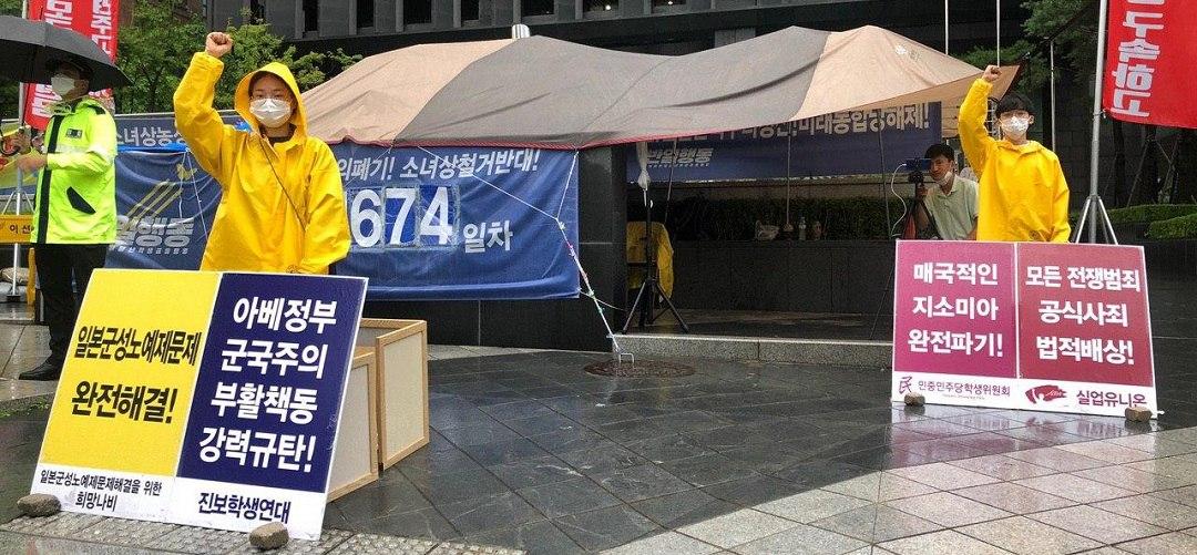 29일 반일행동(반아베반일청년학생공동행동)은 <매국적한일합의폐기! 전쟁범죄사죄배상!>촉구 소녀상농성을 1674일째 진행했다.