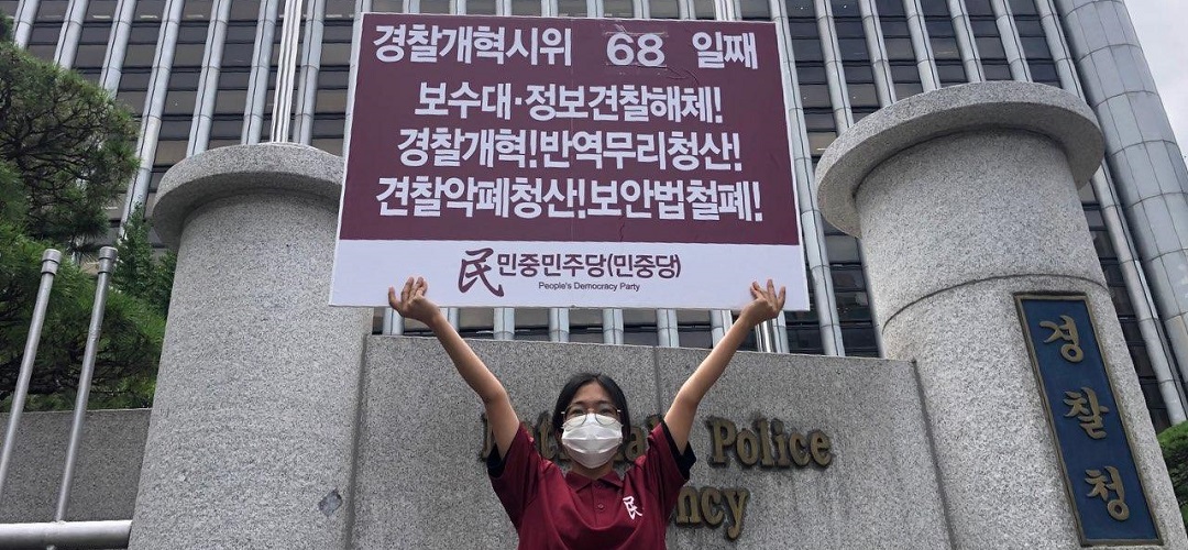 이날 민중민주당은 정보원앞 <프락치공작 책임자처벌!>·<정당탄압 국가정보원해체!>·<파쇼악법 국가보안법철폐!> 일인시위를 69일째 전개했다.