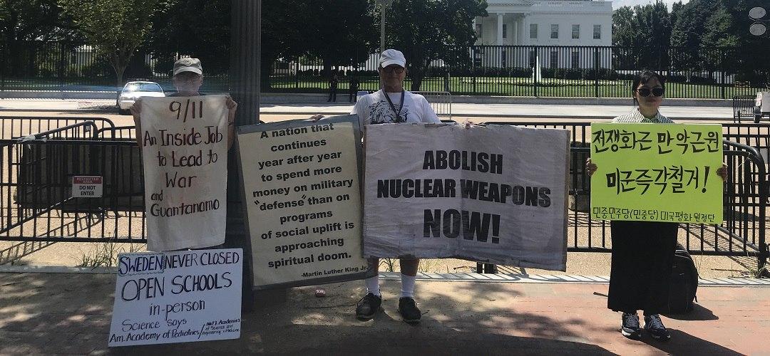 민중민주당(민중당) 미국평화원정단은 14일(현지시간) 워싱턴D.C백악관앞에서 <전쟁화근 만악근원 미군즉각철거!>, <미군유지비증액 트럼프정부규탄!>, <북침전쟁연습 트럼프정부규탄!> 등을 촉구하는 평화시위를 총1195일째 진행했다.