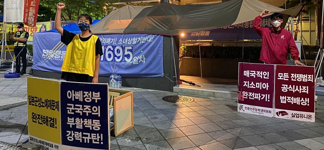 19일 반일행동(반아베반일청년학생공동행동)은 <매국적한일합의폐기! 전쟁범죄사죄배상!>촉구 소녀상농성을 1695일째 진행했다.