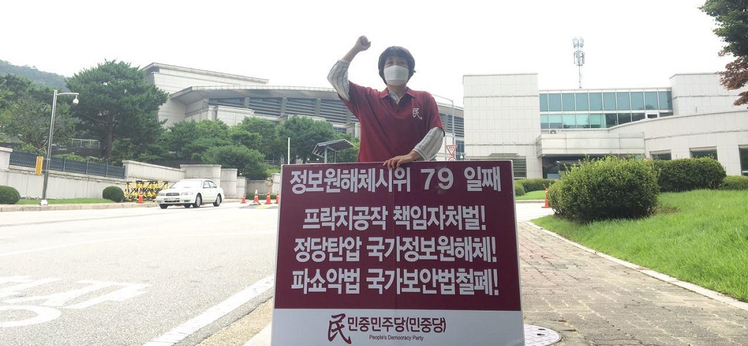 이날 민중민주당은 정보원앞 <프락치공작 책임자처벌!>·<정당탄압 국가정보원해체!>·<파쇼악법 국가보안법철폐!> 일인시위를 79일째 전개했다.