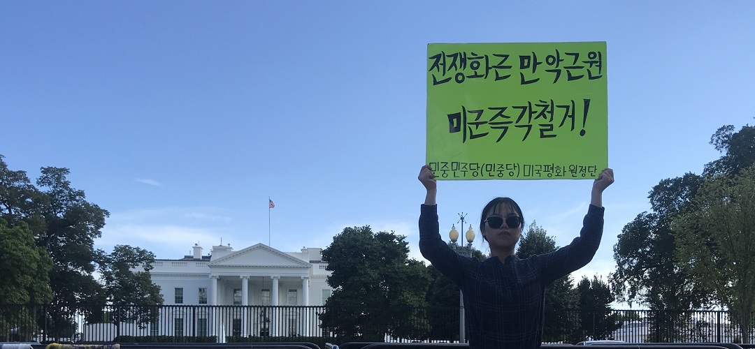 민중민주당(민중당) 미국평화원정단은 23일(현지시간) 워싱턴D.C백악관앞에서 <전쟁화근 만악근원 미군즉각철거!>, <미군유지비증액 트럼프정부규탄!>, <북침전쟁연습 트럼프정부규탄!> 등을 촉구하는 평화시위를 총1204일째 진행했다.