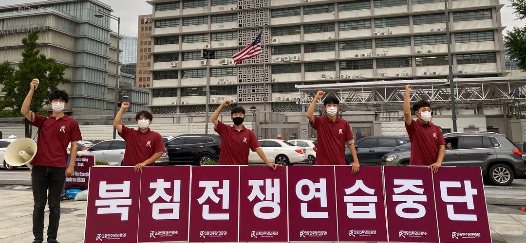민중민주당(민중당)은 27일 미대사관앞에서 <내정간섭망언 해리스추방! 미군유지비증액! 트럼프규탄! 미군철거!>촉구 평화시위를 1500일째 진행했다.