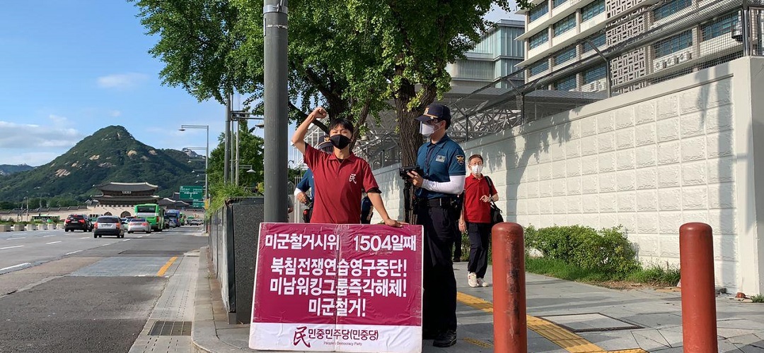 민중민주당(민중당)은 31일 미대사관앞에서 <내정간섭망언 해리스추방! 미군유지비증액! 트럼프규탄! 미군철거!>촉구 평화시위를 1504일째 진행했다.