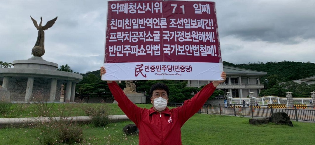 이날 민중민주당은 정보원앞 <프락치공작 책임자처벌!>·<정당탄압 국가정보원해체!>·<파쇼악법 국가보안법철폐!> 일인시위를 89일째 전개했다.