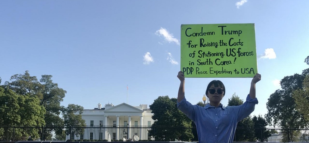 민중민주당(민중당) 미국평화원정단은 6일(현지시간) 워싱턴D.C백악관앞에서 <전쟁화근 만악근원 미군즉각철거!>, <미군유지비증액 트럼프정부규탄!>, <북침전쟁연습 트럼프정부규탄!> 등을 촉구하는 평화시위를 총1218일째 진행했다.