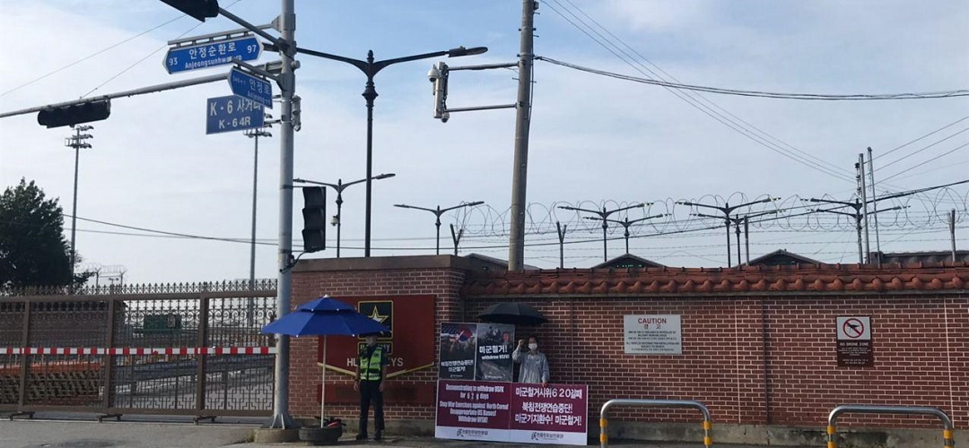 주남미군사령부가 있는 평택험프리스기지앞에서는 <북미협상결렬 트럼프규탄!>·<전쟁연습중단! 미군철거!>구호피시를 들고 미군철거시위를 620일째 진행했다.