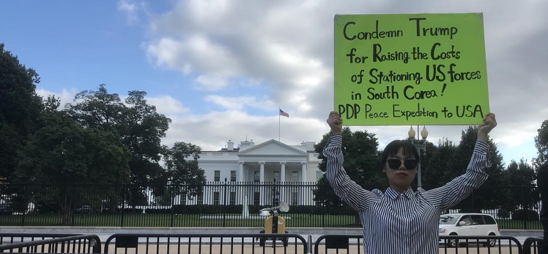 민중민주당(민중당) 미국평화원정단은 12일(현지시간) 워싱턴D.C백악관앞에서 <전쟁화근 만악근원 미군즉각철거!>, <미군유지비증액 트럼프정부규탄!>, <북침전쟁연습 트럼프정부규탄!> 등을 촉구하는 평화시위를 총1224일째 진행했다.