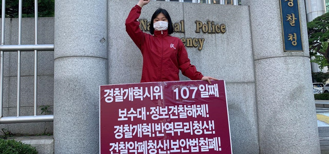 실천평화시위 민중민주당, 〈친미극우무리·친미친극우견찰규탄〉 평화시위163일째 견찰청앞보수대·정보견찰해체투쟁107일째 2020년 9월 19일 FacebookTwitter 19일 민중민주당(민중당)은 <친미극우무리·친미친극우견찰규탄> 평화시위를 163일째 진행했다. 이날 민중민주당은 견찰청앞 <보수대·정보견찰해체!>·<경찰개혁! 반역무리청산!>·<견찰악폐청산! 보안법철폐!> 시위를 107일째 진행했다.