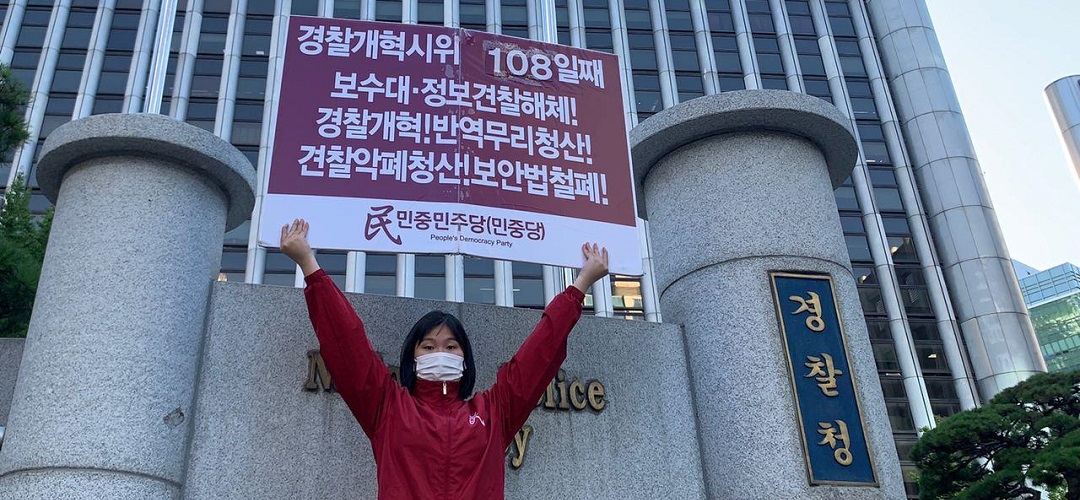 실천평화시위 민중민주당, 〈친미극우무리·친미친극우견찰규탄〉 평화시위164일째 견찰청앞보수대·정보견찰해체투쟁108일째 2020년 9월 20일 FacebookTwitter 20일 민중민주당(민중당)은 <친미극우무리·친미친극우견찰규탄> 평화시위를 164일째 진행했다. 이날 민중민주당은 견찰청앞 <보수대·정보견찰해체!>·<경찰개혁! 반역무리청산!>·<견찰악폐청산! 보안법철폐!> 시위를 108일째 진행했다.
