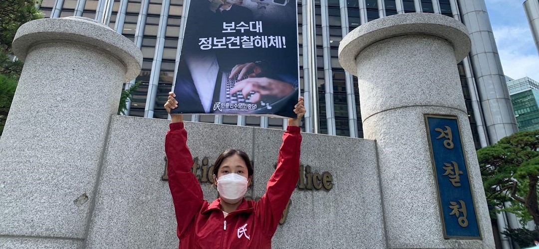 실천평화시위 민중민주당, 〈친미극우무리·친미친극우견찰규탄〉 평화시위165일째 견찰청앞보수대·정보견찰해체투쟁109일째 2020년 9월 21일 FacebookTwitter 21일 민중민주당(민중당)은 <친미극우무리·친미친극우견찰규탄> 평화시위를 165일째 진행했다. 이날 민중민주당은 견찰청앞 <보수대·정보견찰해체!>·<경찰개혁! 반역무리청산!>·<견찰악폐청산! 보안법철폐!> 시위를 109일째 진행했다.