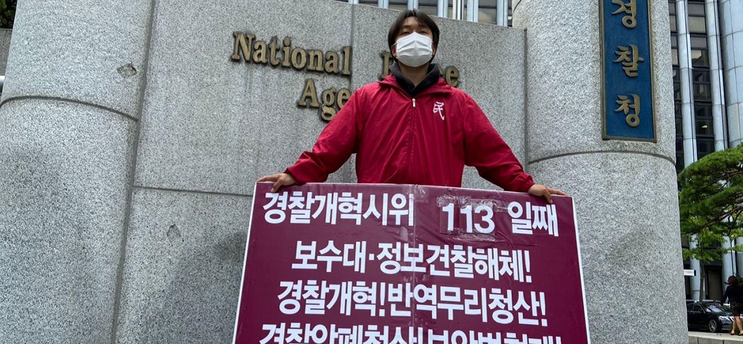 실천평화시위 민중민주당, 〈친미극우무리·친미친극우견찰규탄〉 평화시위169일째 견찰청앞보수대·정보견찰해체투쟁113일째 2020년 9월 25일 FacebookTwitter 25일 민중민주당(민중당)은 <친미극우무리·친미친극우견찰규탄> 평화시위를 169일째 진행했다. 이날 민중민주당은 견찰청앞 <보수대·정보견찰해체!>·<경찰개혁! 반역무리청산!>·<견찰악폐청산! 보안법철폐!> 시위를 113일째 진행했다.