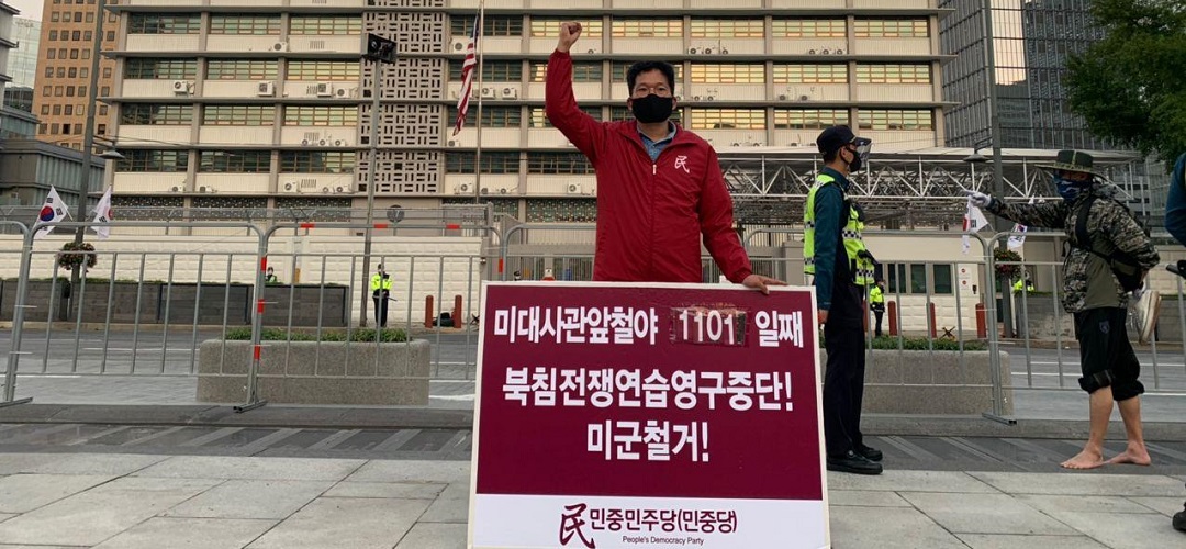 민중민주당(민중당)은 10월1일 미대사관앞에서 <내정간섭망언 해리스추방! 미군유지비증액! 트럼프규탄! 미군철거!>촉구 평화시위를 1535일째 진행했다.