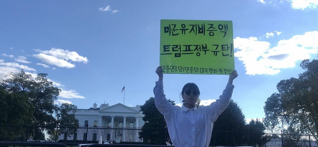 민중민주당(민중당) 미국평화원정단은 3일(현지시간) 워싱턴D.C백악관앞에서 <전쟁화근 만악근원 미군즉각철거!>, <미군유지비증액 트럼프정부규탄!>, <북침전쟁연습 트럼프정부규탄!> 등을 촉구하는 평화시위를 총1245일째 진행했다.