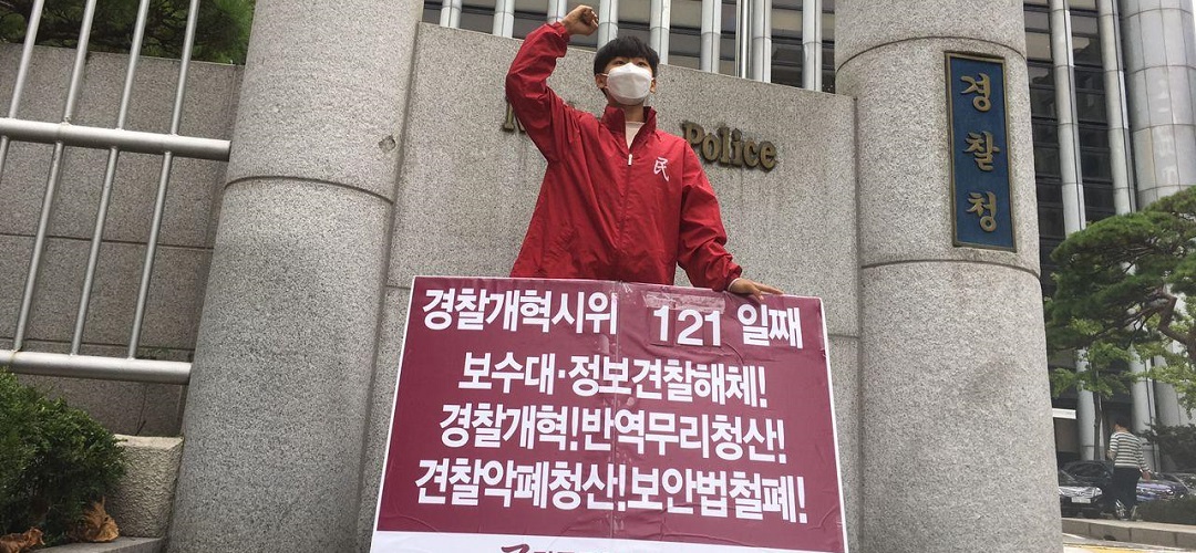 이날 민중민주당은 견찰청앞 <보수대·정보견찰해체!>·<경찰개혁! 반역무리청산!>·<견찰악폐청산! 보안법철폐!> 시위를 121일째 진행했다.