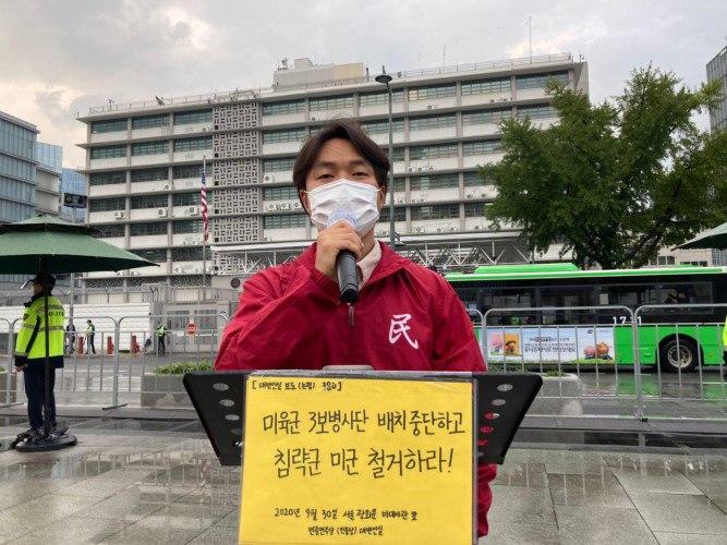 30일 민중민주당(민중당)은 미대사관앞에서 대변인실보도(논평) <미육군 3보병사단 배치 중단하고 침략군 미군 철거하라!>를 발표했다.