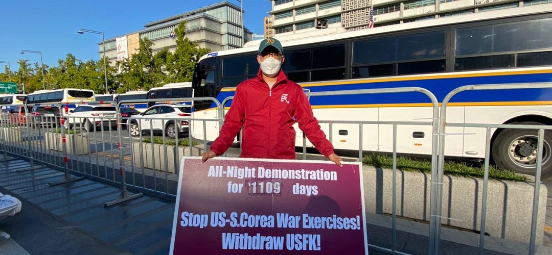 민중민주당(민중당)은 9일 미대사관앞에서 <내정간섭망언 해리스추방! 미군유지비증액! 트럼프규탄! 미군철거!>촉구 평화시위를 1543일째 진행했다.