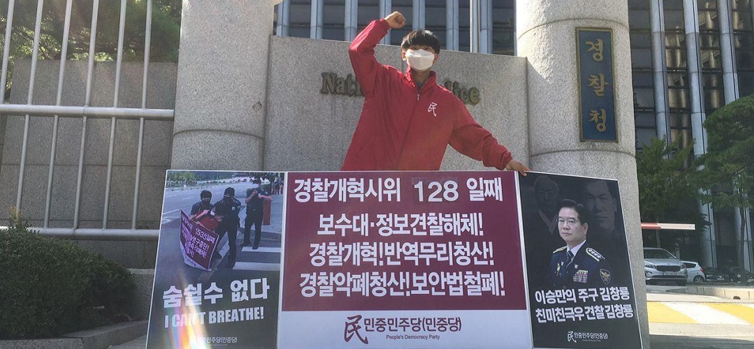 실천평화시위 민중민주당, 〈친미극우무리·친미친극우견찰규탄〉 평화시위184일째 견찰청앞보수대·정보견찰해체투쟁128일째 2020년 10월 10일 FacebookTwitter 10일 민중민주당(민중당)은 <친미극우무리·친미친극우견찰규탄> 평화시위를 184일째 진행했다. 이날 민중민주당은 견찰청앞 <보수대·정보견찰해체!>·<경찰개혁! 반역무리청산!>·<견찰악폐청산! 보안법철폐!> 시위를 128일째 진행했다.