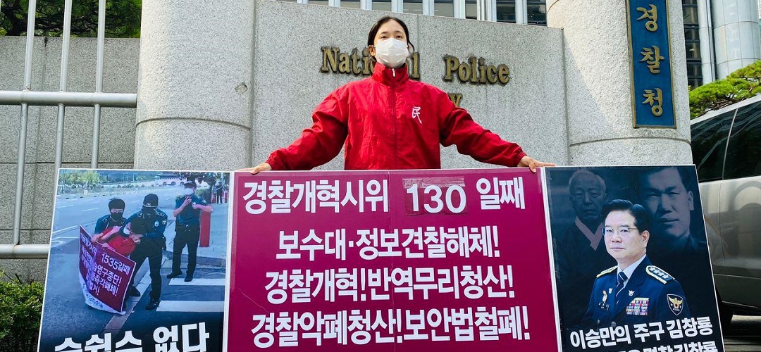 실천평화시위 민중민주당, 〈친미극우무리·친미친극우견찰규탄〉 평화시위186일째 견찰청앞보수대·정보견찰해체투쟁130일째 2020년 10월 12일 FacebookTwitter 12일 민중민주당(민중당)은 <친미극우무리·친미친극우견찰규탄> 평화시위를 186일째 진행했다. 이날 민중민주당은 견찰청앞 <보수대·정보견찰해체!>·<경찰개혁! 반역무리청산!>·<견찰악폐청산! 보안법철폐!> 시위를 130일째 진행했다.