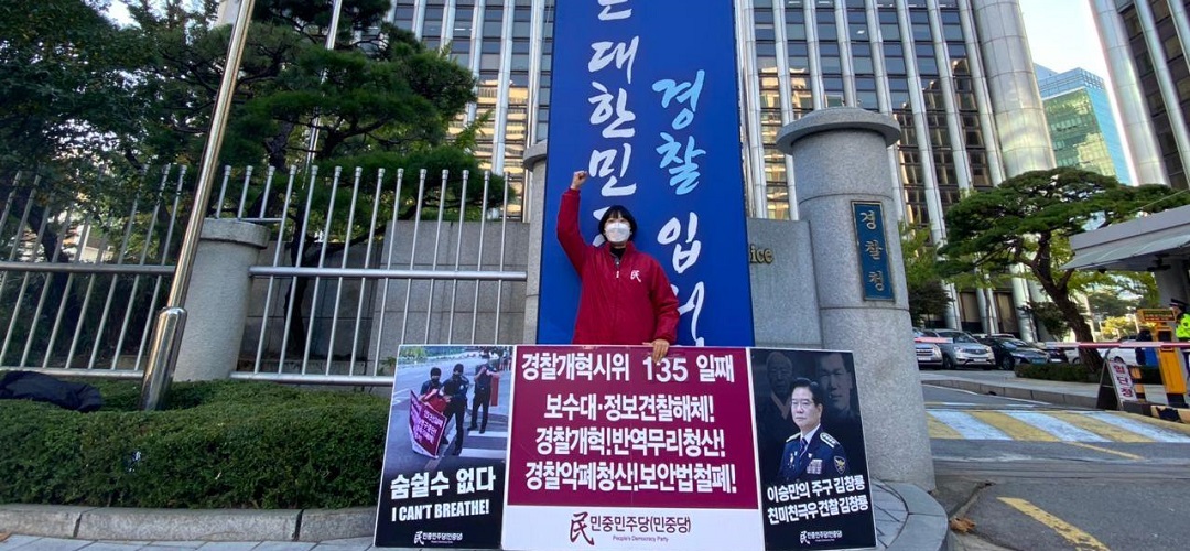 실천평화시위 민중민주당, 〈친미극우무리·친미친극우견찰규탄〉 평화시위191일째 견찰청앞보수대·정보견찰해체투쟁135일째 2020년 10월 17일 FacebookTwitter 17일 민중민주당(민중당)은 <친미극우무리·친미친극우견찰규탄> 평화시위를 191일째 진행했다. 이날 민중민주당은 견찰청앞 <보수대·정보견찰해체!>·<경찰개혁! 반역무리청산!>·<견찰악폐청산! 보안법철폐!> 시위를 135일째 진행했다.