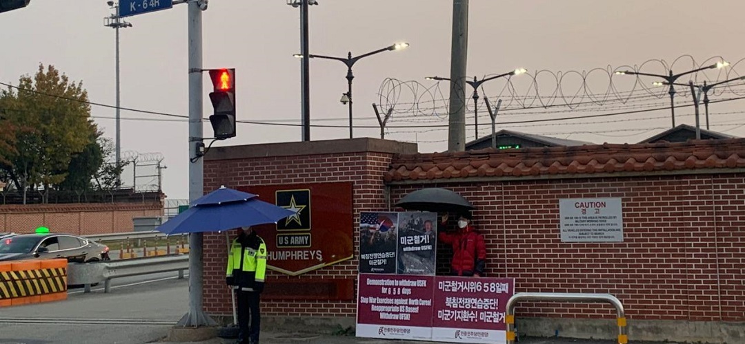 주남미군사령부가 있는 평택험프리스기지앞에서는 <북미협상결렬 트럼프규탄!>·<전쟁연습중단! 미군철거!>구호피시를 들고 미군철거시위를 658일째 진행했다.
