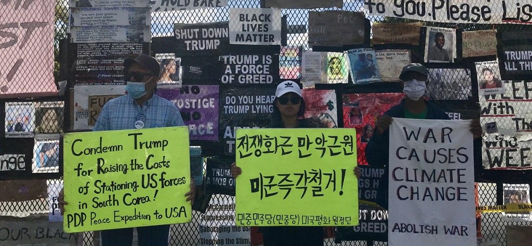 민중민주당(민중당) 미국평화원정단은 23일(현지시간) 워싱턴D.C백악관앞에서 <전쟁화근 만악근원 미군즉각철거!>, <미군유지비증액 트럼프정부규탄!>, <북침전쟁연습 트럼프정부규탄!> 등을 촉구하는 평화시위를 총1265일째 진행했다.