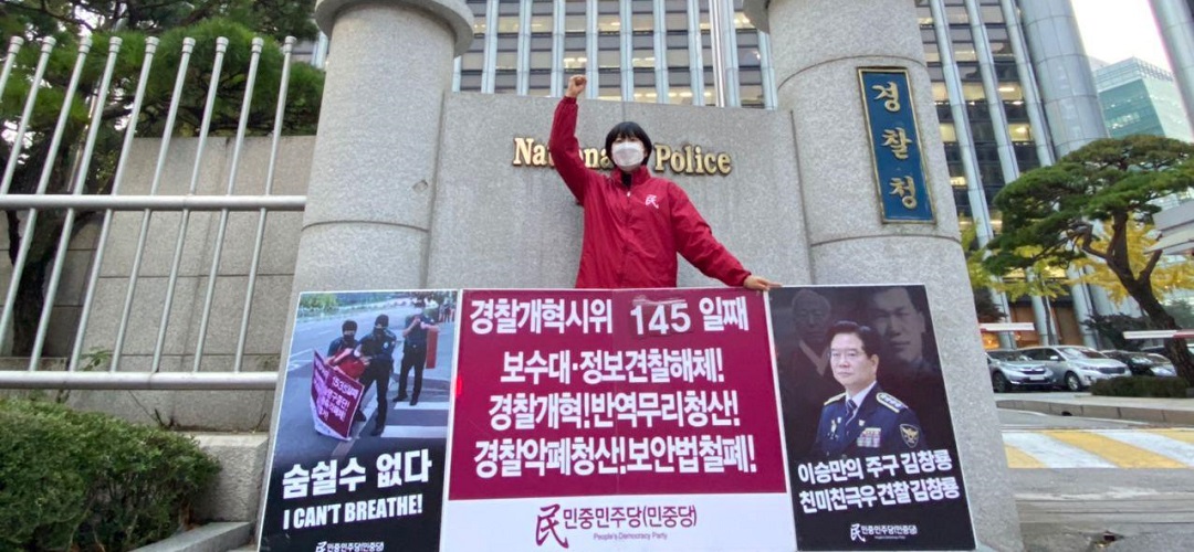 실천평화시위 민중민주당, 〈친미극우무리·친미친극우견찰규탄〉 평화시위201일째 견찰청앞보수대·정보견찰해체투쟁145일째 2020년 10월 27일 FacebookTwitter 27일 민중민주당(민중당)은 <친미극우무리·친미친극우견찰규탄> 평화시위를 201일째 진행했다. 이날 민중민주당은 견찰청앞 <보수대·정보견찰해체!>·<경찰개혁! 반역무리청산!>·<견찰악폐청산! 보안법철폐!> 시위를 145일째 진행했다.
