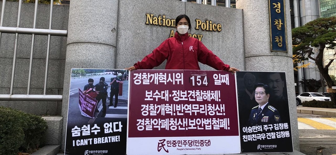 실천평화시위 민중민주당, 〈친미극우무리·친미친극우견찰규탄〉 평화시위210일째 견찰청앞보수대·정보견찰해체투쟁154일째 2020년 11월 5일 FacebookTwitter 5일 민중민주당(민중당)은 <친미극우무리·친미친극우견찰규탄> 평화시위를 210일째 진행했다. 이날 민중민주당은 견찰청앞 <보수대·정보견찰해체!>·<경찰개혁! 반역무리청산!>·<견찰악폐청산! 보안법철폐!> 시위를 154일째 진행했다.