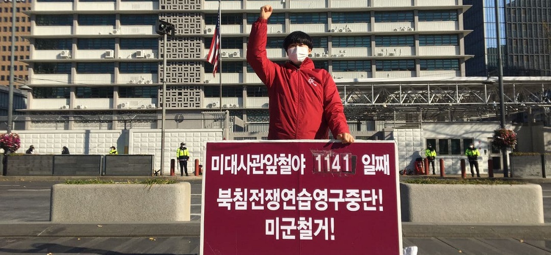 민중민주당(민중당)은 10일 미대사관앞에서 <내정간섭망언 해리스추방! 미군유지비증액! 트럼프규탄! 미군철거!>촉구 평화시위를 1575일째 진행했다.