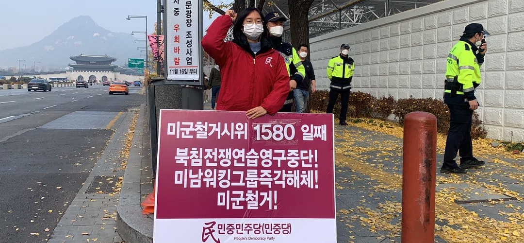 민중민주당(민중당)은 15일 미대사관앞에서 <내정간섭망언 해리스추방! 미군유지비증액! 트럼프규탄! 미군철거!>촉구 평화시위를 1580일째 진행했다.