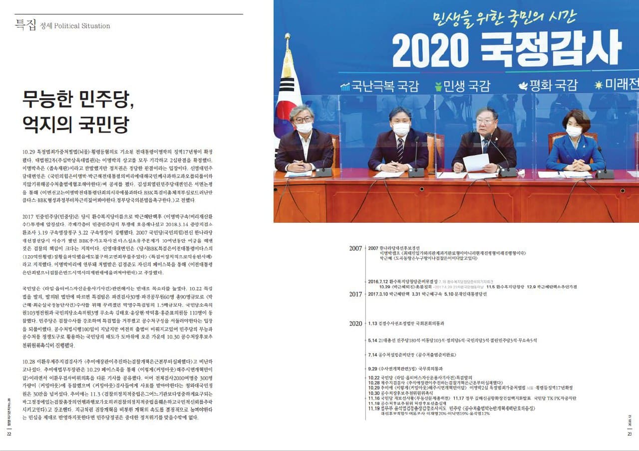 국민당은 <라임·옵티머스자산운용사기사건>관련해서는 반대로 목소리를 높였다. 10.22 특검법을 발의, 발의된 법안에 따르면 특검팀은 파견검사30명·파견공무원60명 총90명규모로 <박근혜·최순실국정농단사건>수사를 위해 꾸려졌던 박영수특검팀의 1.5배규모다. 국민당소속의 원103명전원과 국민의당소속의원3명 무소속 김태호·윤상현·박덕흠·홍준표의원등 110명이 동참했다. 민주당은 검찰수사를 강조하며 특검법을 거부했고 공수처구성을 서둘러야한다는 입장을 되풀이했다. 공수처법시행100일이 지났지만 여전히 출범이 미뤄지고있어 민주당의 무능과 공수처를 정쟁도구로 활용하는 국민당의 태도가 도마위에 오른 가운데 10.30 공수처장후보추천위원위촉식이 진행됐다.